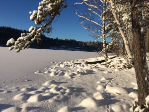 Vi stannade till vid samma ställe som på dit vägen. Skog, sjö och en vacker gård på håll. Ville se och uppleva den platsen igen. Ett förändrat yttre av precis samma plats… Nu täckt av ett vitt, vackert, orört hölje och därför en lite Ljusare upplevelse… precis lika vacker och harmonisk bara på ett lite ljusare och annorlunda sätt.